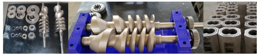 螺桿真空泵屬于非接觸型干式泵,主要部件是一對旋向中目反的螺桿, 與泵體組成封閉的腔體, 兩個螺旋轉(zhuǎn)子作同步反向的高速旋轉(zhuǎn), 電機(jī)的傳動軸連接主動轉(zhuǎn)子, 通過一對高精度的同步齒輪帶動從動螺桿, 通過兩轉(zhuǎn)子的日齒合達(dá)到抽氣的目 的。 螺桿與泵體之間, 兩螺桿之間留有間隙, 相互間無摩擦, 具有抽速范圍寬、 結(jié)構(gòu)簡單緊湊、抽氣腔元件無摩擦、 壽命長、 能耗低、 無油污染等優(yōu)點(diǎn)。 能抽除含有大量蒸汽和少量粉塵的氣體, 不易堵塞, 清洗方便。