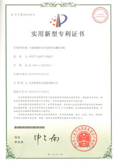 實(shí)用新型名稱:下懸臂螺桿真空泵的空心螺桿結(jié)構(gòu) 專利號(hào): ZL 2016 2 0227302. 7