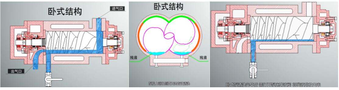 ( 1) 臥式真空泵在清洗時,清洗液從進(jìn)氣口吸入,重力作用直接落入泵腔底端,從出氣口排出。泵腔上端和側(cè)面無法有效清洗,而且臥式泵清洗完畢后,需打開泵底排液閥,將殘液排放出來。